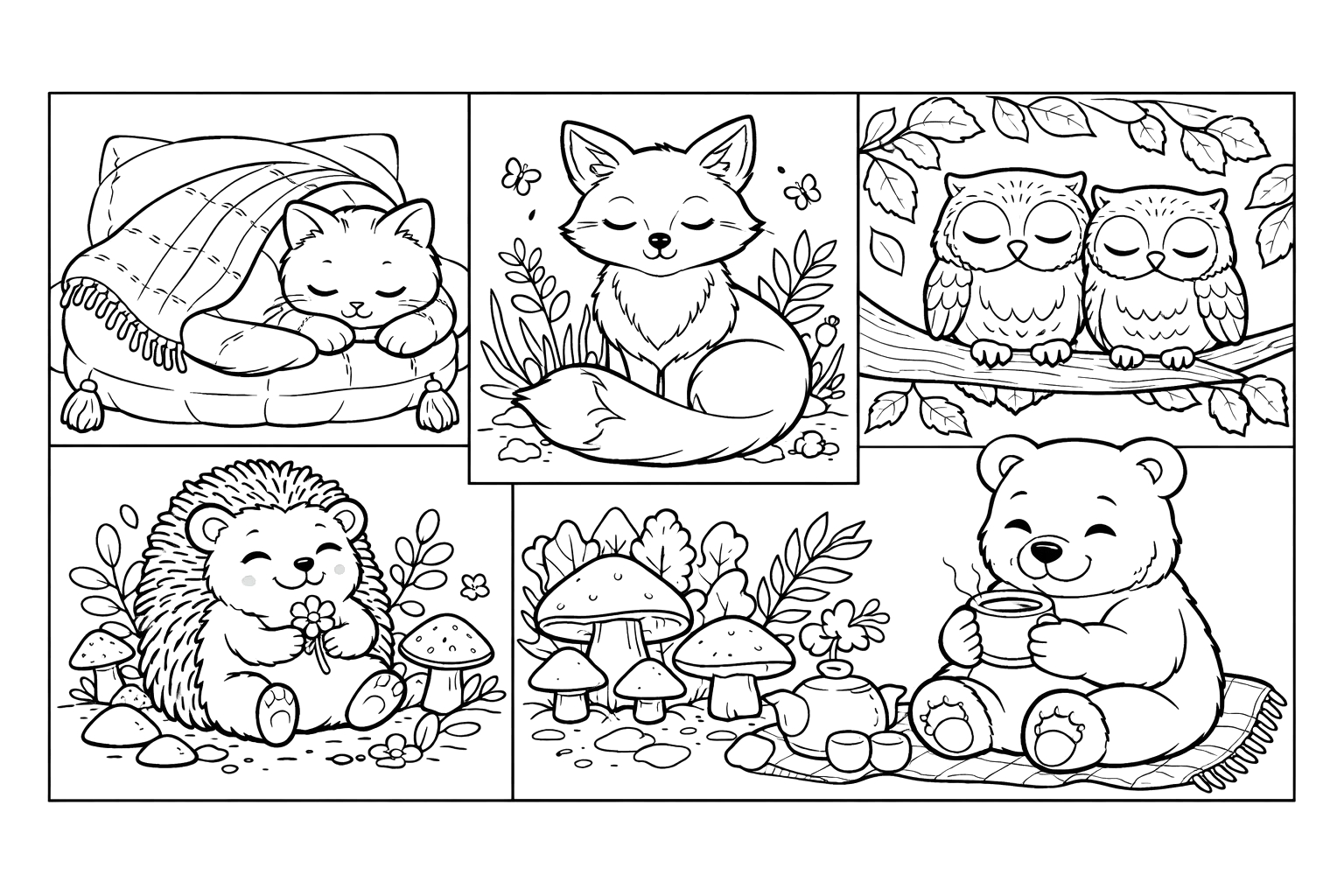 Cozy animals, warm moments, and relaxing illustrations designed for peaceful coloring sessions.