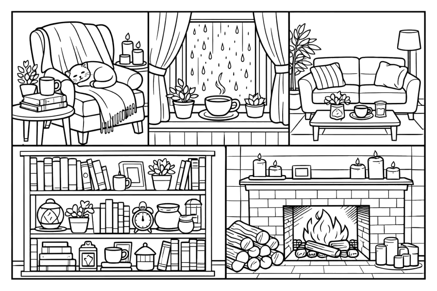 Pages inspired by nature, cozy interiors, and decorative patterns often provide the most relaxing coloring experience.
